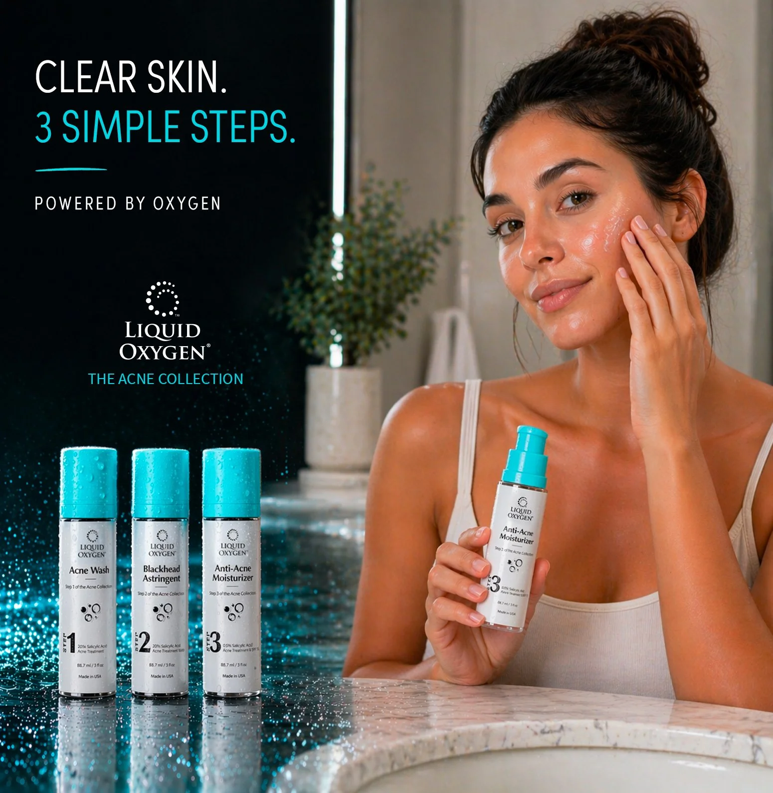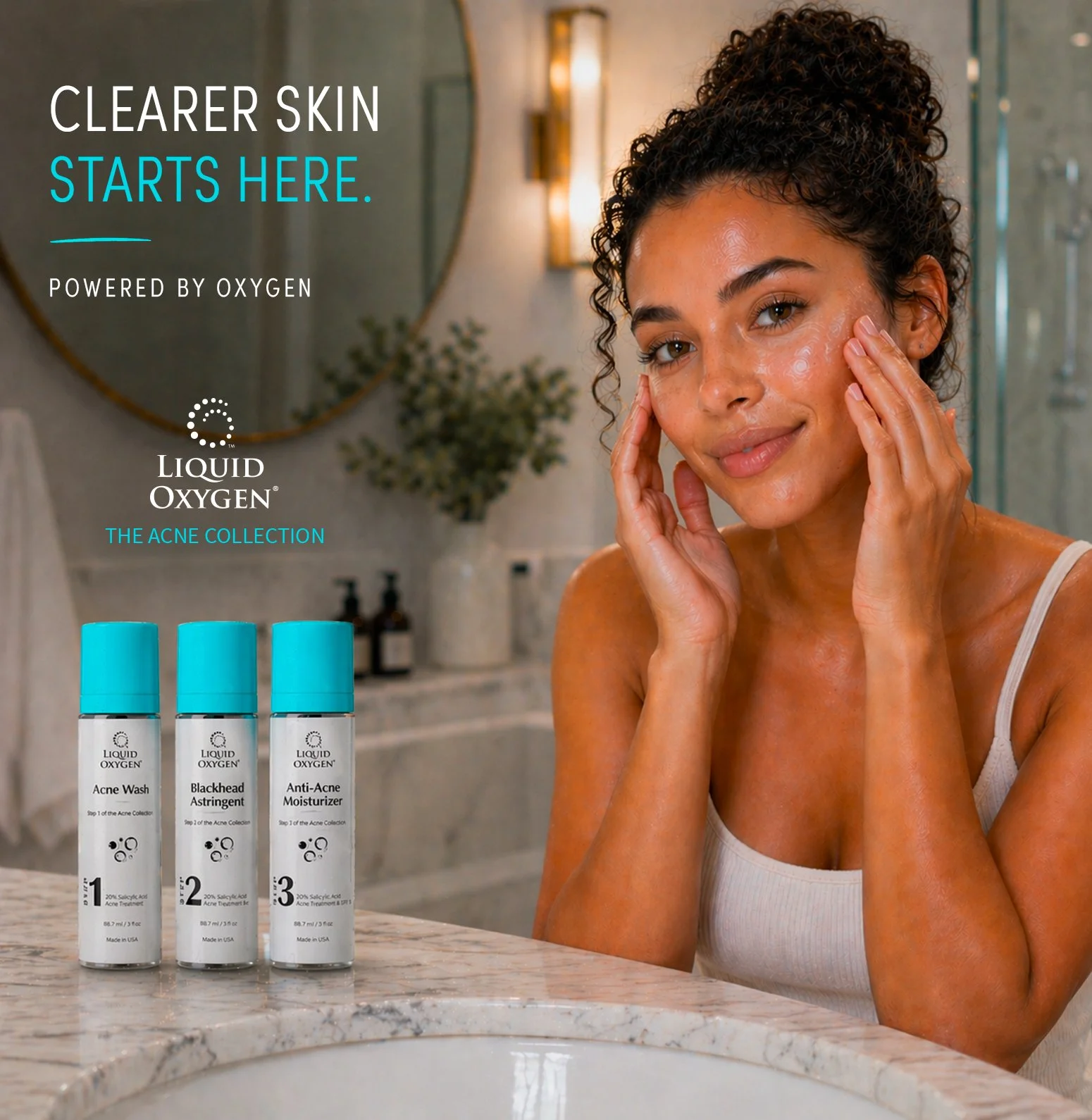 Liquid Oxygen is a clinically driven, three-step acne treatment system designed to target breakouts at their source. Through oxygen-based delivery and active ingredients, it clears congested pores, reduces acne-causing bacteria, and helps calm inflammation while supporting the skin’s natural repair process. The result is clearer, more balanced skin with improved overall texture and resilience.